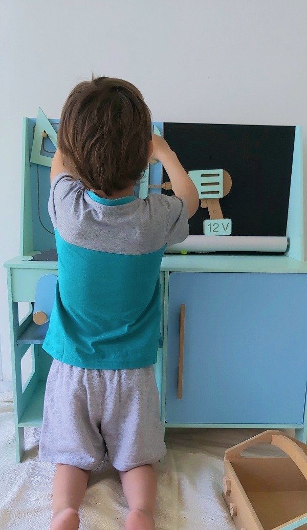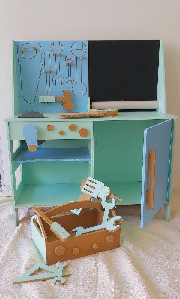 La puerta abre, la sierra gira, con rollo de papel y pizarra.
